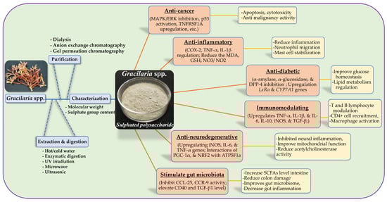 Schematic workflow for sulphated polysaccharides from Gracilaria spp.: extraction, purification, characterization and different biological activities including anti-cancer, anti-inflammatory, anti-diabetic, anti-neurodegenerative, immunomodulatory, and gut microbiota modulation.