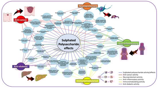 SPs with molecular weights ranging from 1.0 × 102 to 4.0 × 103 kDa appear to exhibit enhanced bioactivity. SPs below this may not adopt conformations conducive to bioactivity. To obtain SPs of the desired Mw, the extraction/purification technique must be optimised to enhance its antioxidant capacity, efficacy and diffusion properties, thus elevating its bioactivity in curing medical conditions []. However, low-Mw SPs of 4.9, 5.5 and 11.6 kDa show moderate bioactivity against influenza virus, anti-cancer activity and anti-inflammatory responses, respectively [,,]. Despite their small size, these SPs exhibit significant bioactivity that should not be overlooked. Thus, the extraction and derivatization of short-chain/low-molecular-weight SPs represents a promising avenue for future research into diverse therapeutic applications [].