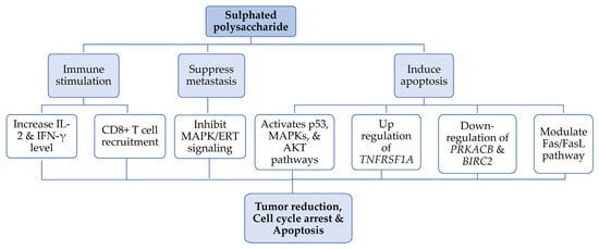 Various research studies have demonstrated the molecular mechanism of cancer suppression by SPs extracted from Gracilaria spp. (Table 2, Figure 3), such as SP from G. lemaneiformis, with an Mw of 1.37 × 103 kDa and a sulphate content of 6.13%, confirmed by HPGPC and GC, respectively. To address its anti-cancer activity, it was administered orally to H22 hepatoma-transplanted female ICR mice. A significant increase in CD8+ cells and IL-2 in the peripheral blood of mice with tumours was detected by flow cytometry using CD3+ monoclonal antibody. This spike in the cytokinesis level promotes T-cell-like macrophage and splenocyte proliferation and results in tumour reduction and inhibition []. Likewise, S180 sarcoma-bearing mice were treated with Gracilaria polysaccharide to examine its anti-tumour activity. GLP treatment enhanced IL-2 and IFN-γ in the peripheral blood of neoplastic mice, indicating that polysaccharides from Gracilaria enhance immunity in mice [].