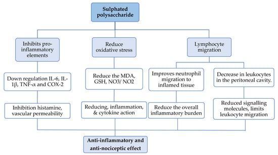 Inflammation, a natural immune response to injury, infection, and stress, can become detrimental if prolonged, contributing to diseases such as asthma, arthritis, neurodegeneration and cancer. While current anti-inflammatory therapies (steroids and non-steroidal drugs) have significant side effects, the need for safer and more effective anti-inflammatory agents is critical []. Studies have demonstrated the anti-inflammatory mechanisms of SPs from Gracilaria spp. (Table 2, Figure 4). Further, to understand their anti-inflammatory activity, SPs (700 kDa) from G. lemaneiformis were treated with UV irradiation (6500 mJ/cm2) and H2O2 (50 mmol/L) for 5, 15 and 30 min. UV/H2O2 significantly decrease the viscosity, particle size, surface and molecular weight to 351.76, 108.37 and 48.62 kDa for 5, 15 and 30 min, respectively. Among the PSs, 5 min and 351.76 kDa showed the best anti-inflammatory activity by inhibiting nitric oxide, TNF-α and IL-6 by 60.49%, 62.81% and 36.29%, respectively, on the IEC-6 cell line. In brief, PS fractions obtained after UV/H2O2 treatment were low in Mw and size, which changed their surface morphology without altering their biochemistry. Thus, by inhibiting NO, TNF-α and IL-6 with a low Mw, GLPs can be highly effective in managing inflammatory and autoimmune diseases []. Another PS from G. cornea with a sulphate content of 15.66% was isolated by papain digestion (60 °C, 6 h) and tested for its ability to inhibit inflammation in carrageenan-induced rat paw oedema. After intraperitoneal administration of GLP in 3, 9 and 27 mg/kg doses, PS reduced neutrophil migration. The 3 and 9 mg/kg doses inhibited oedema in rats, which was confirmed by the myeloperoxidase activity assay. Administration of a higher dose (27 mg/kg) resulted in an observed antinociceptive effect (suppression of pain detection response) in rats, leading to a reduction in latency time. After 14 consecutive days, histopathological evaluations confirmed that PS treatment had no adverse effect on internal organs, supporting the potential use of G. cornea PS as an anti-inflammatory and antinociceptive agent [].