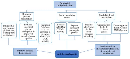 Wen et al. isolated a 21.2 kDa low-molecular-weight polysaccharide with a high galactose content and a 19.64% sulphate level from G. lemaneiformis []. SP was injected into streptozotocin-induced diabetic mice (streptozotocin causes irreversible damage to pancreatic β-cells); after a six-week animal trial, it was found that SP repaired pancreatic β-cells, inhibited α-amylase activity and downregulated lipoxygenase activity. On the other hand, G. lemaneiformis PS regulated insulin and blood urea better than metformin (a commercial anti-diabetic drug). Additionally, biochemical assays on diabetic mouse livers revealed elevations in glycolytic enzymes, such as GCK (glucokinase) and G-6-PD (glucose-6-phosphate dehydrogenase), and depression in G-6-Pase (glucose-6-phosphatase) levels. The above synchronised enzymatic mechanisms can increase glucose uptake and decrease hepatic glucose breakdown, improving glucose homeostasis in diabetes. Evidently, low-molecular-weight PS from G. lemaneiformis can be an alternative/adjuvant anti-diabetic supplement [].