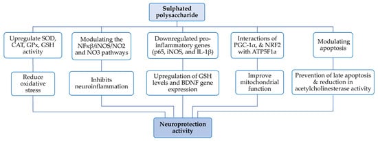 Similarly, hot-water-extracted SP from G. gracilis was introduced into the HT-22 cell line (mouse hippocampal cell line, first damaged by 50 µM ZnSO4), which induced neurotoxicity and caused a 50% reduction in cell viability []. Then, treatment with SP restored cell viability to 95%, preventing late apoptosis and necrosis triggered by zinc, thus revealing the neuroprotective capacity of SPs. Regarding oxidative parameters, SOD, CAT (catalase) and GSH levels were reduced in Zn-induced cells. Adding to this, SP infusion into Zn-impaired HT-22 cells increased antioxidant enzymes and glutathione levels while reducing acetylcholinesterase activity. This supports the notion that SP from G gracilis is a potential treatment for neurodegeneration, cholinergic dysfunction and neuroinflammation [].