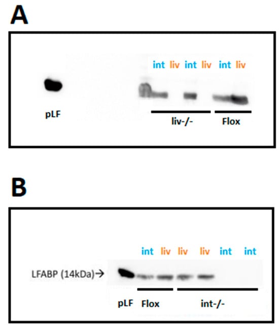 Tissue-specific ablation of LFABP was confirmed by Western blot, with LFABPLiv-/- mice expressing LFABP only in the intestine (Figure 2A) and LFABPint-/- mice expressing LFABP only in the liver (Figure 2B). Control LFABPfl/fl mice expressed LFABP in both the liver and the intestine as expected (Figure 2).