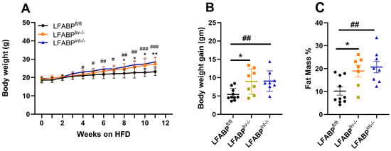 Body weight, body weight gain, and fat mass % for LFABPfl/fl (●), LFABPliv-/- (■), and LFABPint-/- (▲) mice after 12 weeks of 45% Kcal HF feeding. (A) Body weights (n = 8–10); (B) Body weight gain (n = 8–10); (C) Fat mass percentage (n = 8–9). Data are given as mean ± SD, analyzed using Student’s t-test. *, p < 0.05 and **, p < 0.01 for LFABPliv-/- versus LFABPfl/fl; #, p < 0.05, ##, p < 0.01, and ###, p < 0.001 for LFABPint-/- versus LFABPfl/fl. LFABP, liver fatty acid-binding protein; LFABPfl/fl, floxed liver fatty acid-binding protein; LFABPint-/-, intestine-specific liver fatty acid-binding protein knockout; LFABPliv-/-, liver-specific liver fatty acid-binding protein knockout.