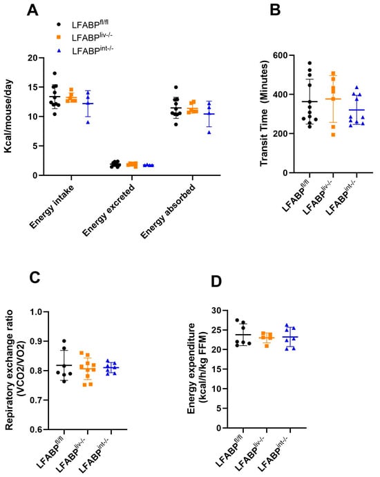 3.3. The Ablation of LFABP from Either the Liver or Intestine Does Not Alter Net Energy Absorption, Intestinal Transit Times, or Energy Expenditure