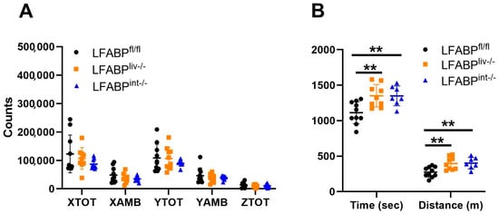 Analyses of spontaneous activity and exercise endurance capacity for LFABPfl/fl (●), LFABPliv-/- (■), and LFABPint-/- (▲) mice after 12 weeks of 45% Kcal HF feeding. (A) 24 h spontaneous activity (n = 8–10); (B) Exercise endurance running time and distance (n = 7–10). Data are given as mean ± SD, analyzed using Student’s t-test. **, p < 0.01 for LFABP cKO mice versus LFABPfl/fl mice. AMB, ambulatory; LFABPfl/fl, floxed liver fatty acid-binding protein; LFABPint-/-, intestine-specific liver fatty acid-binding protein knockout; LFABPliv-/-, liver-specific liver fatty acid-binding protein knockout; TOT, total.