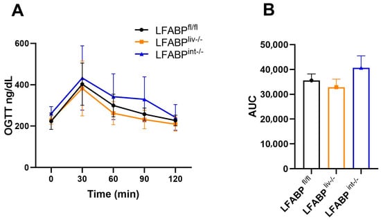 OGTT for fasted LFABPfl/fl (●), LFABPliv-/- (■), and LFABPint-/- (▲) mice after 12 weeks of 45% Kcal HF feeding. (A) OGTT (n = 7–13); (B) OGTT area under the curve (AUC) (n = 7–13). Data are given as mean ± SD for figure (A) and mean ± SE for figure (B), analyzed using Student’s t-test. LFABP, liver fatty acid-binding protein; LFABPfl/fl, floxed liver fatty acid-binding protein; LFABPint-/-, intestine-specific liver fatty acid-binding protein knockout; LFABPliv-/-, liver-specific liver fatty acid-binding protein knockout; OGTT, oral glucose tolerance test.