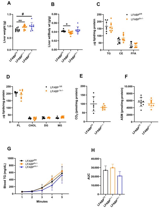 Liver weights and hepatic lipid handling in LFABPfl/fl (●), LFABPliv-/- (■), and LFABPint-/- (▲) mice after 12 weeks of 45% Kcal HF feeding. (A) Liver weight (n = 9–10); (B) Liver weight/body weight ratio (n = 9–10); (C) Hepatic neutral lipids (TG, CE, and FFA) levels (n = 7–8); (D) Hepatic lipid species (n = 6–8); (E) FA oxidation rate, 14CO2 production (n = 8–9); (F) FA oxidation rate, 14C-labeled ASMs (n = 10–11); (G) Blood VLDL-TG level (n = 5–14); (H) VLDL secretion rates AUC (n = 5-14). Data are given as mean ± SD for panels A–G, and mean ± SE for panel H, analyzed using Student’s t-test. *, p < 0.05 and **, p < 0.01 LFABPliv-/- versus LFABPfl/fl; #, p < 0.05 for LFABPint-/- versus LFABPfl/fl. ASM, acid soluble metabolite; CHOL, cholesterol; CE, cholesteryl ester; DG, diglyceride; FA, fatty acid; LFABPfl/fl, floxed liver fatty acid-binding protein; LFABPint-/-, intestine-specific liver fatty acid-binding protein knockout; LFABPliv-/-, liver-specific liver fatty acid-binding protein knockout; MG, monoglyceride; PL, phospholipid; TG, triglyceride.
