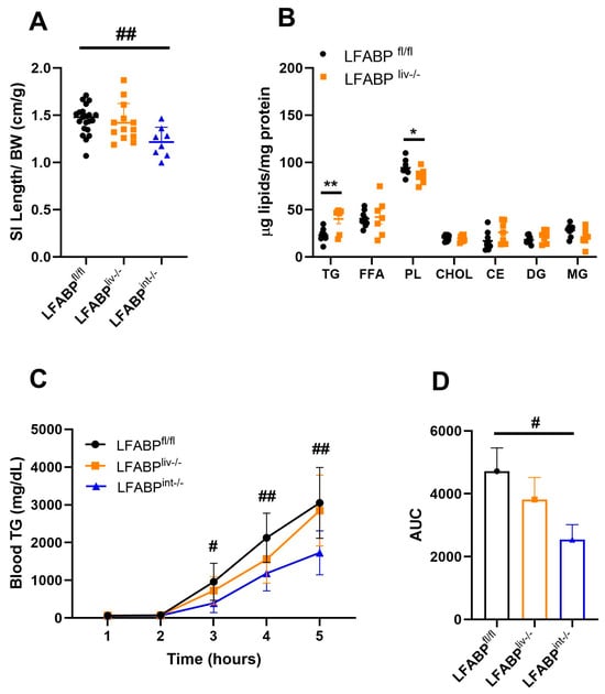 We assessed the effects of liver-specific or intestine-specific ablation of LFABP on the intestine. The ratio of intestinal length to body weight was not different for LFABPliv-/- mice but was lower for the LFABPint-/- relative to their controls (Figure 8A). The intestine of LFABPliv-/- mice displayed a significantly higher accumulation of TG and reduction of PL relative to LFABPfl/fl (Figure 8B). Since the redistribution of intestinal lipids could result from changes in TG-rich chylomicron secretion, OFTTs were performed to assess whether the secretion of TG-rich chylomicrons was affected by the ablation of LFABP specifically from the liver or the intestine. The intestine-specific ablation of LFABP resulted in a substantial ~50% decline in chylomicron secretion (Figure 8C,D), and the LFABPliv-/- mice showed a smaller, ~19%, reduction in chylomicron secretion (Figure 8C,D). The lower TG secretion observed in the two cKO mice lines is in keeping with the decline in chylomicron secretion found in obesity [25,49].