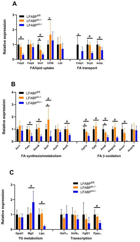 Relative quantitation of mRNA expression of genes involved in liver and intestinal lipid homeostasis in 45% Kcal fat HF-fed LFABPfl/fl and cKO mice. (A) Expression of hepatic genes involved in FA/lipid uptake and FA transport (n = 4–9); (B) Expression of hepatic genes involved in FA synthesis and oxidation (n = 4–9); (C) Expression of hepatic genes involved in TG metabolism and expression of transcriptional genes (n = 4–9); (D) Expression of intestinal genes involved in lipid metabolic pathways (n = 5–6); Data are given as mean ± SD, analyzed using Student’s t-test. *, p < 0.05 for LFABPliv-/- versus LFABPfl/fl; #, p < 0.05 for LFABPint-/- versus LFABPfl/fl. LFABPfl/fl, floxed liver fatty acid-binding protein; LFABPint-/-, intestine-specific liver fatty acid-binding protein knockout; LFABPliv-/-, liver-specific liver fatty acid-binding protein knockout.