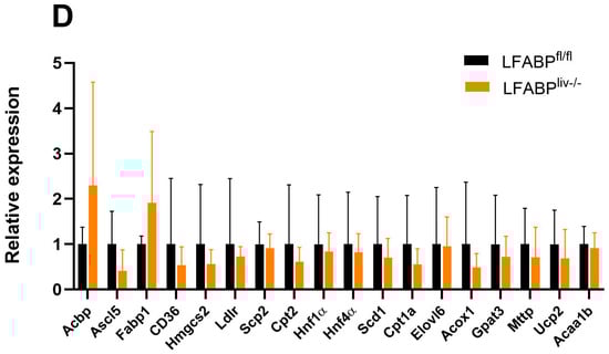 Since mice challenged with chronic HF feeding progressively develop fatty liver in addition to obesity, we investigated the effects of long-term HFD combined with liver- or intestinal-LFABP ablation on the liver phenotype. While absolute liver weight was significantly higher in LFABPliv-/- mice, the liver weight/body weight ratio was significantly somewhat lower relative to LFABPfl/fl control mice. The liver weight of LFABPint-/- mice was also greater but the liver weight/body weight ratio was comparable to the control mice (Figure 7A,B). Despite the greater obesity of the cKO mice, hepatic TG levels in overnight-fasted LFABPliv-/- were comparable to their LFABPfl/fl control counterparts; no differences were found in other lipid species as well, including CE, FFA, PL, cholesterol, diglycerides (DG), and monoglycerides (MG), when compared with the LFABPfl/fl controls (Figure 7C,D). Lower levels of hepatic TG are similar to previous findings in whole-body LFABP knockout mice [20,48]. No significant differences were found in the rate of hepatic FA oxidation, assessed by quantifying 14CO2 and 14C-labeled ASMs in liver homogenates, for either cKO mice when compared with the floxed control mice (Figure 7E,F).