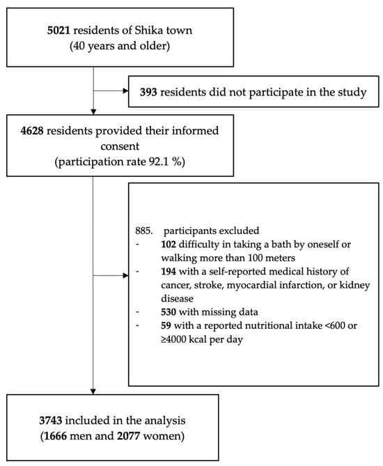 All residents aged 40 years or older who had a certificate of residence in the model districts (Horimatsu, Higashi Masuho, Tsuchida, and Togi) of Shika town, Ishikawa Prefecture, Japan were included in this study. Shika town is located on the Noto Peninsula and had a total population of 22,663 in April 2013. A baseline survey was conducted in 2013–2016 to collect information on nutrient intake and participant characteristics. The baseline study included 5021 subjects, and 4628 participated in the study (participation rate, 92.1%). The participation criteria were as follows: ability to take a bath independently and walk at least 100 m as conditions for adequate activities of daily living (ADL). In addition, participants with cancer, stroke, myocardial infarction, kidney disease, missing nutrition data, or an energy intake <600 or ≥4000 kcal per day were excluded. Therefore, 3743 subjects (1666 men and 2077 women) were ultimately followed up (Figure 1).