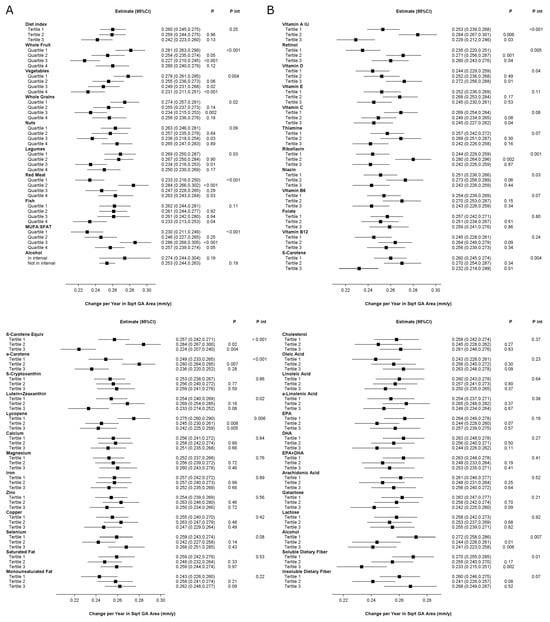 Geographic atrophy area-based progression rates, according to the quantiles of dietary index or intake in the Age-Related Eye Diseases Study: (A) Alternative Mediterranean Diet Index and its nine components; (B) nutrients. Higher quantiles indicate higher adherence to the Alternative Mediterranean Diet, higher intake of its components, or higher intake of individual nutrients. The exceptions are red meat, where higher quantiles indicate lower intake, i.e., higher adherence to the Alternative Mediterranean Diet, and alcohol, where “in interval” refers to intake within the specified interval. Abbreviations: CI = confidence interval; DHA = docosahexaenoic acid; EPA = eicosapentaenoic acid; GA = geographic atrophy; IU = international units; MUFA:SFAT = monounsaturated fatty acid–saturated fatty acid ratio.