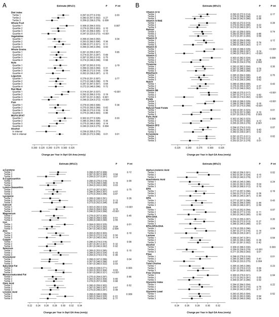 For eight nutrients, an association with slower progression was present at the nominal level. For seven nutrients, an association with faster progression was present at the nominal level.