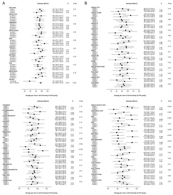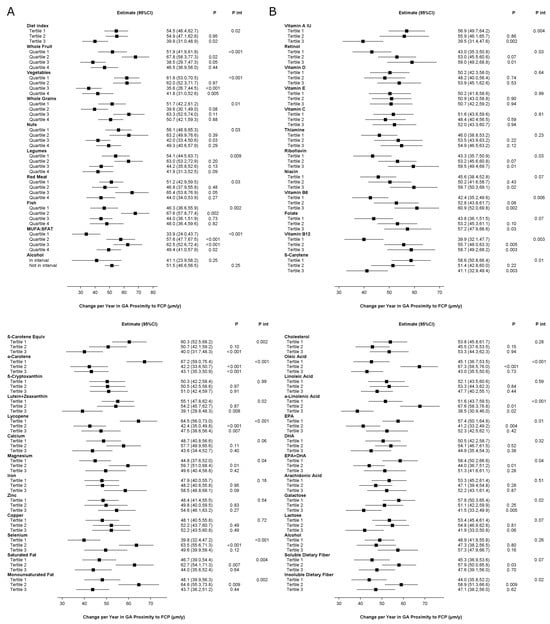 Geographic atrophy proximity-based progression rates, according to quantiles of dietary index or intake in the Age-Related Eye Diseases Study: (A) Alternative Mediterranean Diet Index and its nine components; (B) nutrients. Higher quantiles indicate higher adherence to the Alternative Mediterranean Diet, higher intake of its components, or higher intake of individual nutrients. The exceptions are red meat, where higher quantiles indicate lower intake, i.e., higher adherence to the Alternative Mediterranean Diet, and alcohol, where “in interval” refers to intake within the specified interval. Abbreviations: CI = confidence interval; DHA = docosahexaenoic acid; EPA = eicosapentaenoic acid; GA = geographic atrophy; IU = international units; MUFA:SFAT = monounsaturated fatty acid–saturated fatty acid ratio.