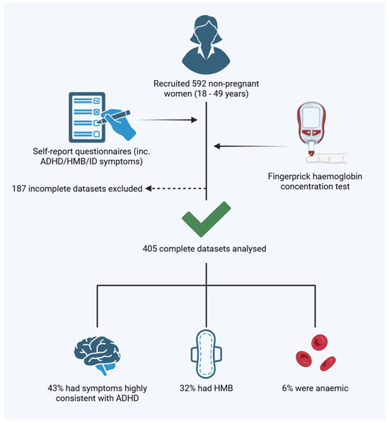 Women are at an increased risk of developing an iron deficiency during their reproductive years [24]. Heavy menstrual bleeding (HMB) is the most common aetiology of iron deficiency in women during their reproductive years, as heavier periods can result in almost double the amount of iron lost per period in comparison to those with regular menstrual flow [24]. The taboo nature of discussions regarding menstrual flow implements a rate-limiting factor to HMB diagnosis; however, HMB is estimated to affect between 25 and 53% of menstruating women [24]. Despite the hypothesis regarding the influence of iron deficiency on symptoms of ADHD, no studies have explored a potential link between HMB, as a common risk factor for iron deficiency development, and symptoms of ADHD. As a systemically underappreciated condition in women [8], we wished to further explore the presentation of ADHD symptoms in women and to explore whether HMB and iron deficiency could play a role in symptom development.
