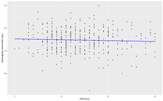 Haemoglobin concentration against CDS score. Linear regression analysis showed multiple R-squared: 0.0022, adjusted r-squared: −0.001989, F test = 0.9197 and p = 0.3381.