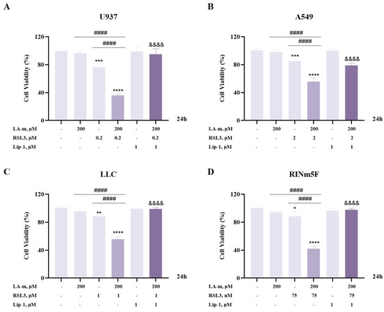 To assess the impact of medium-chain fatty acids on ferroptosis, U937 human leukemia cells, A549 lung cancer cells, LLC cells, and RINm5F rat insulinoma cells were treated with LA-m, RSL3, or their combination for 24 h, and the changes of cell viability were measured by CCK8 (for U937) or crystal violet staining. As shown in Figure 1, when compared with the untreated group, LA-m treatment alone did not affect the cell viability of any of the cell lines, and RSL3 treatment resulted in significant reductions in cell viability of varying degrees for all cell lines. However, whether compared with the control group or the LA-m or RSL3 treatment groups alone, the combination would result in a further significant reduction in cell viability, with U937 cell viability reduced to 36% (Figure 1A), A549 and LLC cell viability reduced to 55.9% (Figure 1B,C), and RINm5F cell viability reduced to 42.2% (Figure 1D). Thus, LA-m sensitized RSL3-induced cancer cell death.