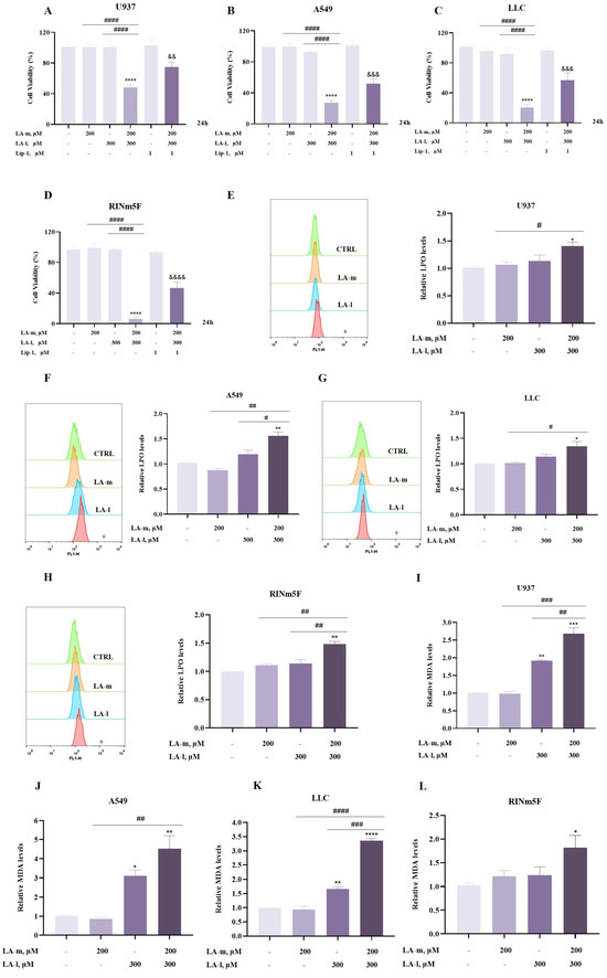 The enhanced cytotoxic effect induced by the combination of LA-m and LA-l is linked to ferroptosis. (A) U937 human leukemia cells were treated with LA-m, LA-l or their combination in the absence or presence of ferroptosis inhibitor Lip-1 for 24 h, and their viability was determined using CCK8. (B–D) A549 lung cancer cells (B), Lewis lung cancer (LLC) cells (C), and RINm5F rat insulinoma cells (D) were treated with LA-m and LA-l alone or their combination in the absence or presence of ferroptosis inhibitor Lip-1 for 24 h, and the changes of cell viability were measured by crystal violet staining. (E–H) After the treatment, the levels of intracellular LPO were quantified using flow cytometry after staining with Liperfluo in U937 human leukemia cells (E), A549 lung cancer cells (F), Lewis lung cancer (LLC) cells (G), and RINm5F rat insulinoma cells (H); “+” means: combination of LA-m and LA-l. (I–L) The content of intracellular MDA was measured by commercial kit in U937 human leukemia cells (I), A549 lung cancer cells (J), Lewis lung cancer (LLC) cells (K), and RINm5F rat insulinoma cells (L). Results are expressed as the mean ± SD (n = 3), * p < 0.05, ** p < 0.01, *** p < 0.001 and **** p < 0.0001 versus the control group. # p < 0.05, ## p < 0.01, ### p < 0.001 and #### p < 0.0001 versus the LA-m or LA-l group. && p < 0.01, &&& p < 0.001 and &&&& p < 0.0001 versus the combination group.