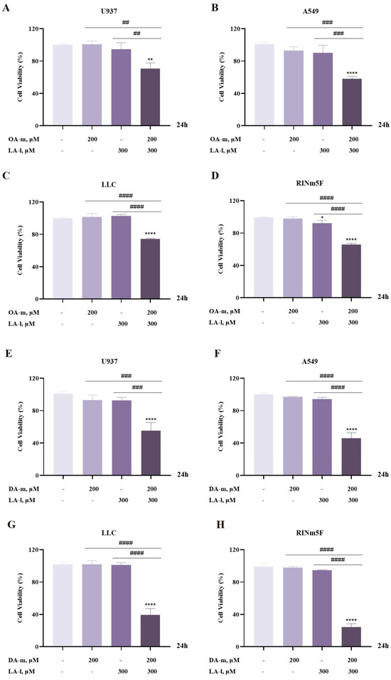 The above experimental results have demonstrated that LA-m enhanced the cytotoxic effect of LA-l on cancer cells, and then we questioned whether the enhanced cell death induction by LA-m and LA-l combination could also be induced by combining other medium-chain fatty acids, such as octanoic acid (OA-m) or decanoic acid (DA-m), with LA-l. Next, we explored the combined cytotoxicity of OA-m and DA-m with LA-l on U937 human leukemia cells, A549 lung cancer cells, Lewis lung cancer (LLC) cells, and RINm5F rat insulinoma cells, and the results are shown in Figure 5. Compared with the untreated group, OA-m, DA-m or LA-l alone did not significantly affect cell viability. However, the combination of OA-m with LA-l decreased U937 cell viability to 70.7% (Figure 5A), A549 cell viability to 58.2% (Figure 5B), LLC cell viability to 74.1% (Figure 5C) and RINm5F cell viability to 65.9% (Figure 5D). Similarly, the combination of DA-m with LA-l decreased U937 cell viability to 55.3% (Figure 5E), A549 cell viability to 45.7% (Figure 5F), LLC cell viability to 39.5% (Figure 5G) and RINm5F cell viability to 24.3% (Figure 5H). Furthermore, we also found that DA-m enhanced the cytotoxicity of LA-l against cancer cells more than OA-m, and we speculated that this may be related to the length of the fatty acid carbon chain. In summary, medium-chain fatty acids generally enhanced the cytotoxicity of LA-l on cancer cells.