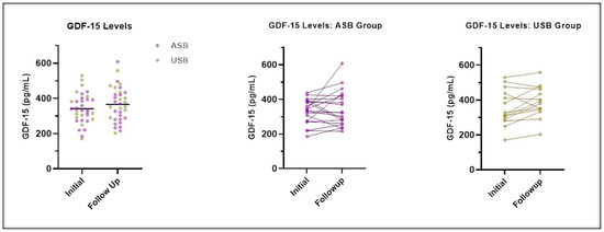 Thirty-six participants (44% from the USB group) completed the study. Table 2 summarizes changes in BMI, BMI 95th percentile, BMI z-score, and GDF-15 from baseline to the 12-week follow-up. Although the USB group showed a greater decrease in BMI, %95th percentile, and BMI z-score, and a greater increase in GDF-15 levels (Figure 1) compared to the ASB group, none of these changes were statistically significant. There was no change in A1c or dietary intake.