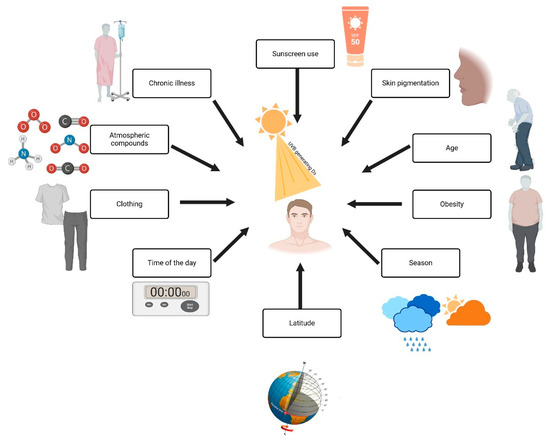Factors influencing vitamin D synthesis and UVB exposure. Created with Biorender [10].