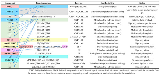 Lumisterol forms hydroxy-lumisterols like 20(OH)-L3 and 22(OH)-L3. These metabolites regulate skin homeostasis and immunological responses [21]. Additional enzymatic reactions produce lumisterol-derived secosteroids, which resemble vitamin D analogs.