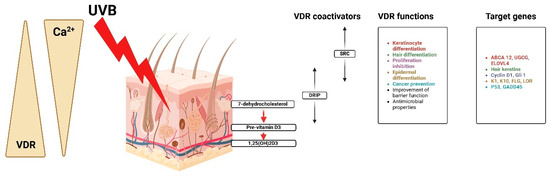 Calcium, VDR, and coactivators regulate keratinocyte activities, proliferation, and differentiation. Created with Biorender [10].
