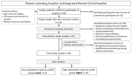 This was an experimental study with a dietary intervention (DI) lasting 6 weeks. The sample was recruited in the clinical cardiac intensive care ward during hospitalisation (Figure 1). The inclusion criteria were 45 to 80 years, and cardiovascular events included a myocardial infarction over the last 24 months before hospitalisation. The exclusion criteria were a failure to meet the inclusion criteria, residence outside the Poznań area (>20 km), any dieting including weight reduction therapies, food allergy or food intolerance, kidney or mental diseases, planned modifications of pharmacotherapy in the course of the DI, and the consumption of dietary supplements (Figure 1). Initially, 150 cardiovascular patients were invited by medical staff to attend. The planned intervention programme was described in detail to all invited subjects during the individual interview. The course and plans of pending treatment modifications, pharmacotherapy, confirmation of concomitant diseases, and any dietary modifications were excluded. The place of residence was important due to the regular delivery of antioxidant snacks and requirement for personal contact with the subjects.