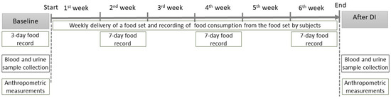Dietary data were collected using a multi-day food record method: a 3-day food record at baseline, and three 7-day food records during the 2nd, 4th, and 6th weeks of the DI. Blood and urine samples and anthropometrics were collected at baseline and after 6 weeks of the DI. Biological material was protected and stored at a certified laboratory. Anthropometric measurements were taken by a trained dietician (Figure 2).