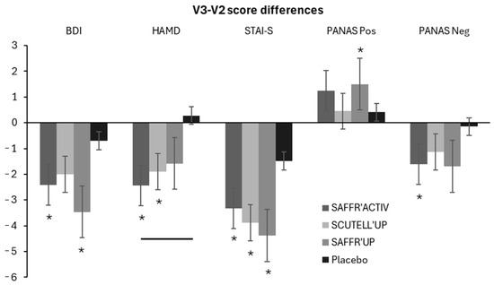 Depression, anxiety, and emotion assessment. Positive and negative score differences between V3 and V2 for the questionnaires BDI, HAMD, STAI-S, and PANAS in the SAFFR’ACTIV, SCUTTEL’UP, SAFFR’UP, and Placebo groups. Results are presented as the mean ± SD. An asterisk indicates a difference between V3 and V2 within a group (p < 0.05). A line indicates a difference between an intervention and the placebo group (p < 0.05).