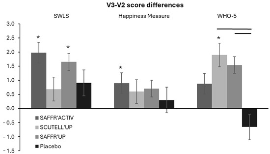 Well-being assessment. Score differences between V3 and V2 for the questionnaires SWSL, Happiness Measure, and WHO-5 in SAFFR’ACTIV, SCUTTEL’UP, SAFFR’UP, and Placebo groups. Results are presented as the mean ± SD. An asterisk indicates a difference between V3 and V2 within a group (p < 0.05). A line indicates a difference between an intervention and the placebo group (p < 0.05).