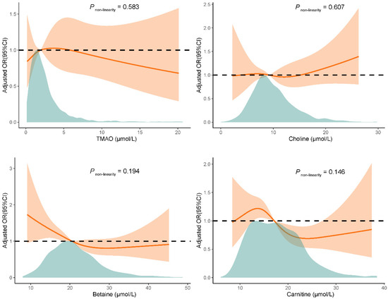 Then, we examined the association between four metabolites and GDM risk. As shown in Table 2, significant associations were observed between the precursors—choline, betaine, and carnitine—with the risk of GDM, in multivariable-adjusted models as continuous variables. Specifically, for each standard deviation (SD) increase in choline levels, the odds of developing GDM increased by 16% in the multivariate-adjusted model (OR = 1.16, 95% CI: 1.01, 1.34, p = 0.039). In contrast, lower risks of GDM were observed with an increased level of betaine and carnitine, per SD increase in betaine and carnitine were associated with a 19% (OR = 0.81, 95% CI: 0.70, 0.95; p = 0.010) and 20% (OR = 0.80, 95% CI: 0.69, 0.94; p = 0.007) decrease in the risk of GDM. When analyzing metabolite concentrations by quartiles and comparing them to the lowest quartile, the estimates for the risk in the second and fourth quartiles of betaine were 0.65 (Q2 vs. Q1, 95% CI: 0.44, 0.96, p = 0.029) and 0.49 (Q4 vs. Q1, 95% CI: 0.32, 0.75, p = 0.001), respectively. Similarly, compared with the lowest quartile of carnitine, both the third quartile (Q3 vs. Q1, OR = 0.62, 95% CI: 0.41, 0.94, p = 0.024) and the fourth quartile (Q4 vs. Q1, OR = 0.47, 95% CI: 0.30, 0.74, p = 0.001) of maternal plasma carnitine levels were associated with a decreased risk of GDM (per SD increment, OR = 0.83, 95% CI: 0.73, 0.95; p = 0.008). However, no significant associations were identified between TMAO levels and GDM risk, whether assessed as continuous variables or by quartiles. Furthermore, as depicted in Figure 1, restricted cubic spline models revealed no evidence of non-linear associations between any of the four metabolites and GDM risk (Pfor non-linearity > 0.05).