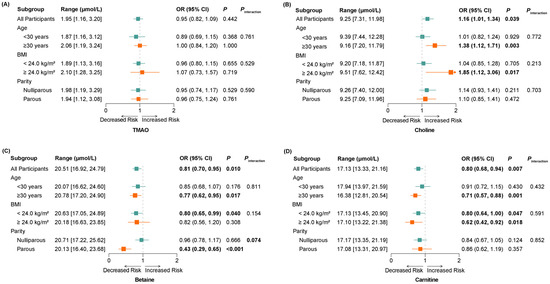 Then, we conducted stratified analyses to explore whether the associations between TMAO, its precursors, and GDM were modified by age, BMI, or parity. As shown in Figure 2, the associations between choline, betaine, and carnitine with GDM appeared more pronounced among women aged ≥30 years. The BMI-stratified analysis revealed distinct patterns in the associations between metabolite concentrations and GDM. Choline demonstrated a significant positive association with GDM in women with BMI ≥ 24.0 kg/m2 (OR = 1.85, 95% CI: 1.12, 3.06; p = 0.017), whereas betaine was inversely associated with GDM in the lower BMI group (<24.0 kg/m2) (OR = 0.80, 95% CI: 0.65, 0.99; p = 0.040). Carnitine exhibited a consistent negative association with GDM across both BMI categories (p < 0.05). However, interactions between these metabolites and age or BMI did not reach statistical significance (Pinteraction > 0.15). Notably, a significant interaction between betaine and parity was observed (Pinteraction < 0.05). In parous women, each SD increase in betaine concentration was associated with a 57% reduction in GDM risk (OR = 0.43, 95% CI: 0.29, 0.65; p < 0.001), whereas no significant association was detected in nulliparous women.