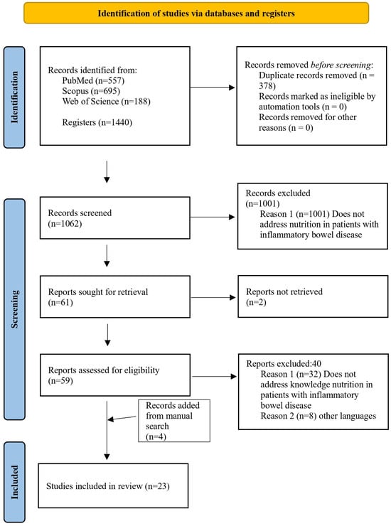Following a detailed full-text screening, 1004 articles were excluded for not meeting the inclusion criteria (e.g., irrelevant population, outcomes not related to nutritional knowledge, or insufficient methodological rigor). Figure 1 presents a PRISMA flow diagram outlining the study selection process. The final selection included 23 studies deemed relevant to the research questions. Studies were included in the synthesis based on predefined eligibility criteria, ensuring relevance to the research question.