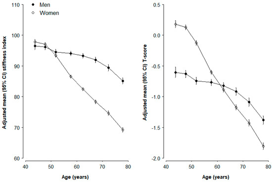 Adjusted mean levels of stiffness index (SI) and T-score by age and sex. Values were adjusted for region, and vertical lines crossing the dots represent 95% CIs. Solid black dots represent data from men, and open dots represent women.