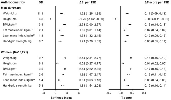 Associations of anthropometric measures with stiffness index (SI) and T-score. All analyses were adjusted for age; region; education; income; smoking; physical activity; consumption of alcohol, tea, fresh fruit, milk, and coarse grains; and, in women, menopause status. * Analyses were mutually adjusted for fat mass index and lean mass index. Black squares represent values in men and white squares represent values in women. Horizontal lines crossing the point estimates represent 95% CIs. p values for heterogeneity between men and women were <0.05 for all except for BMI, which was 0.60 for SI and 0.45 for T-score. SD↑ indicates per standard deviation higher.