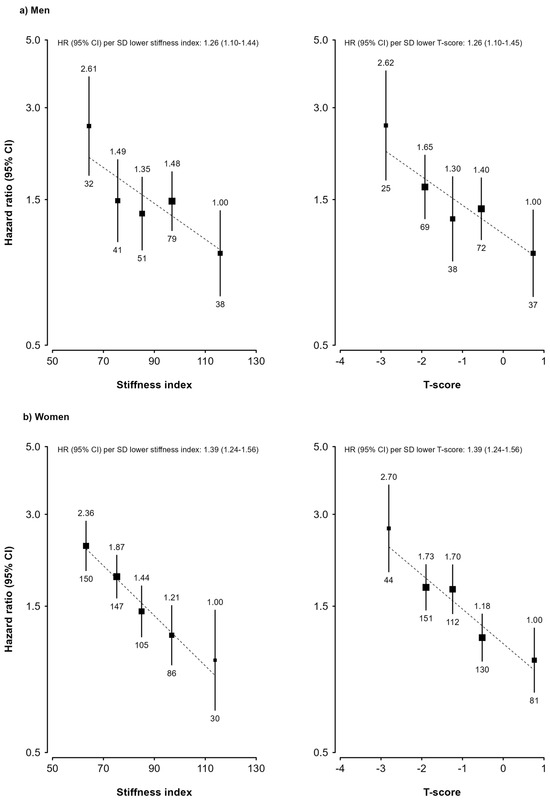Hazard ratios of stiffness index and T-score with risk of fracture in the China Kadoorie Biobank. Cox regression models were stratified by age-at-risk and region and adjusted for age; education; income; smoking; physical activity; consumption of alcohol, tea, fresh fruit, coarse grains, and milk; and, in women, menopause status. Vertical lines crossing the black squares (point estimates of HRs) represent 95% CIs of HRs. The numbers above the vertical lines are the HRs, and the numbers below the vertical lines are the number of cases. The dashed lines represent linear associations of either SI or T-score with risk of fracture. Panel (a) represents results for men, and panel (b) represents results for women. p values for heterogeneity between men and women was 0.26 for SI and 0.27 for T-score.
