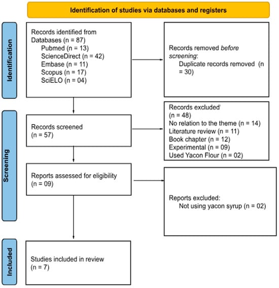 The initial search across the databases retrieved 87 articles. After removing 30 duplicates, 57 articles remained for title and abstract screening. Then, the inclusion criteria, as mentioned above, were applied and 48 articles were excluded—primarily because they had investigated the sensory acceptability of yacon, focused on osmotic dehydration or production costs, or lacked relevant clinical data. Nine articles were selected for full-text review, and ultimately, seven studies were included in this systematic review. The complete study selection process is summarized in Figure 1. We did not impose any geographical restrictions during the selection process; studies from all regions were considered as long as they met the inclusion criteria. However, no eligible articles were identified outside South America and Europe. Consequently, the final set of included studies is limited to those regions.