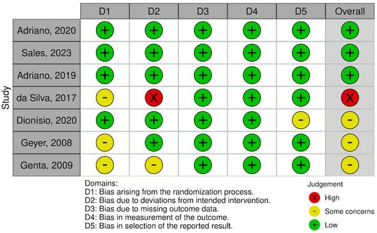 The quality of the included studies was assessed in terms of risk of bias across multiple domains. Figure 2 and Figure 3 show that the studies generally demonstrated a low risk of “bias arising due to missing outcome data” and “bias in measurement of the outcome”. However, some concerns were noted in “bias due to deviations from intended interventions” and “bias arising from the randomization process”. Three of the studies were assessed as low risk of bias in all domains [29,30,31]. In contrast, one study was classified as high risk in the domain of “deviations from intended interventions” because, although it was described as double-blind, the authors did not clarify how blinding was ensured or whether personnel were truly blinded. Despite no major deviations being reported and an appropriate analysis approach, the lack of transparency on blinding procedures prompted a high-risk assessment in that domain [32]. Overall, these findings still suggest robust design and reporting in most areas across the included studies.