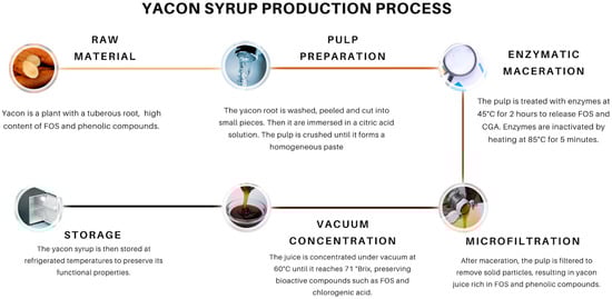 Another study was performed in Switzerland, where the yacon syrup processing was carried out at the University Hospital of Basel [22]. In another study using yacon potatoes from Peru, yacon syrup had 41.39% FOSs, 25.65% sugars, 2.16% proteins, and 0.14% lipids [21]. Table 3 presents relevant information on yacon syrup production and analysis mentioned in the respective studies.