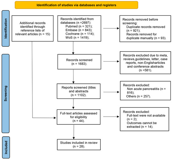 Comprehensive electronic searches were conducted in databases, including Web of Science, Embase, Cochrane Library, and PubMed, covering all publications in English through to 10 May 2024. Our search strategy involved the use of Medical Subject Headings (MeSH), including “Enteral Nutrition”, “Intolerance”, and “Pancreatitis”, complemented by corresponding keywords in the titles and abstracts. The Boolean operator ‘OR’ was used to combine search terms in database queries. Additionally, manual searches of the reference lists from relevant studies were performed to identify potential omissions. The full search strategy is shown in Supplementary Table S1.