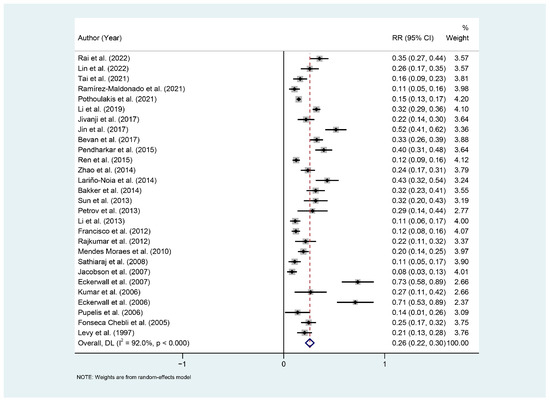 The quality scores are presented in Suplementary Table S3. The quality of the studies varied, with 17 of 28 studies demonstrating high methodological quality [19,21,22,23,24,27,28,30,35,36,37,38,39,40,41,43,44]. Lower scores were commonly due to potential selection bias and inadequate control of confounding factors, such as assessment timing, severity of AP, and patient age. The p-values obtained from Harbord’s test (p = 0.614) and Peter’s test (p = 0.458) indicated no significant evidence of publication bias in the meta-analysis data.