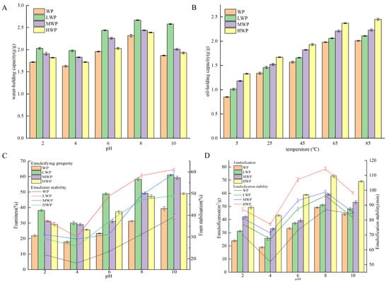 (A) Water-holding capacity, (B) oil-holding capacity, (C) emulsification stability, and (D) foaming stability of WP and WPHs of various molecular weights.