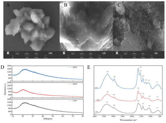 (A) SEM of LWP, (B) SEM of MWP, (C) SEM of HWP, (D) XRD plots of WPHs with different molecular weights, and (E) FTIR plots of WPHs with different molecular weights.