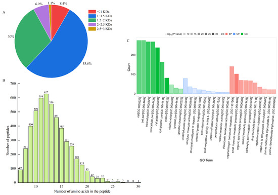 (A) Molecular weight distribution of peptides; (B) chain length peptide identification of peptides; (C) GO functional annotation.