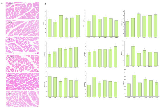 (A) Fatigue indicators; (B) muscle morphological analysis of mice in each group at 20× magnification.