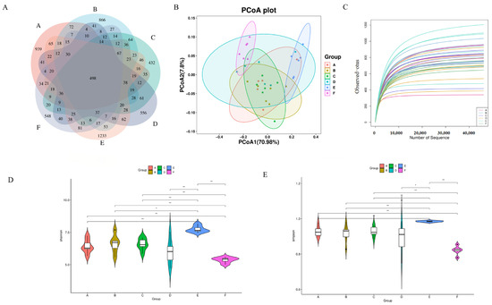 (A) Wayne plot of ASVs (Groups A–F are subgroups for animal experiments, as described in 2.9); (B) PCoA plot; (C) dilution curve; (D) Simpson’s exponent; (E) Shannon’s exponent. * p ≤ 0.05, ** p ≤ 0.01.