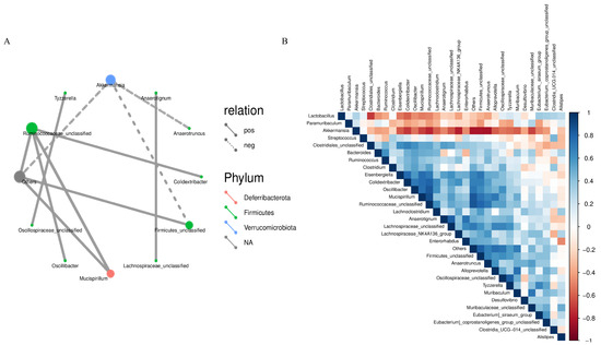 (A) Correlation network diagram of mouse gut microbial communities; (B) OTU-based heatmap of correlation of mouse gut flora.