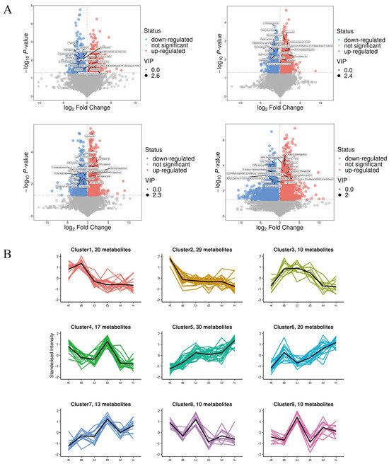 (A) Volcanic map of differential metabolites; (B) K-means clustering analysis of the differentially accumulated metabolites into nine clusters according to their expression profile. The cluster names and the number of metabolites for each cluster are indicated. (The masked metabolite in A vs. C is (23S, 24S)-17,23-Epoxy-24,29-dihydroxy-27-norlanost-8-ene-3,15-dione; A vs. F is Combretastatin A4).